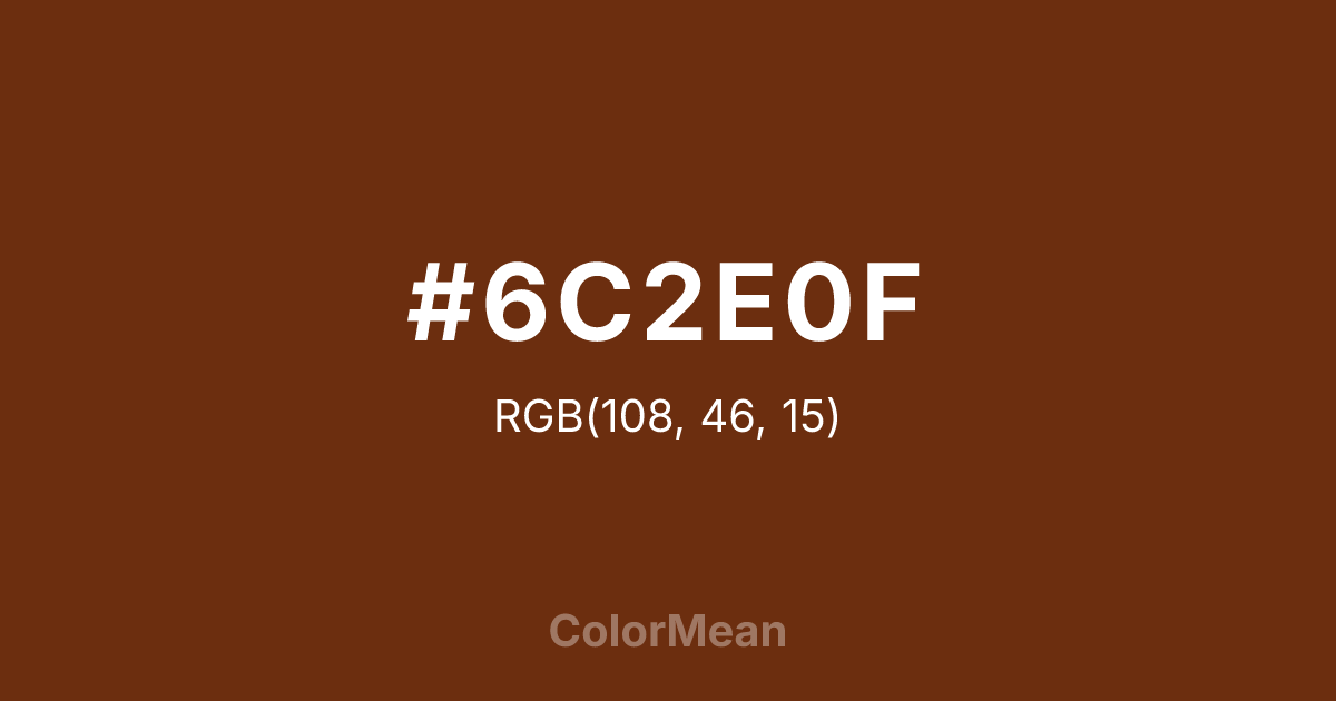 #6C2E0F RGB value is (108, 46, 15). The hex color red value is 108, green is 46, and blue is 15. Its HSL format shows a hue of 20°, saturation of 76 percent, and lightness of 24 percent. The CMYK process values are 0 percent, 57 percent, 86 percent, 58 percent.