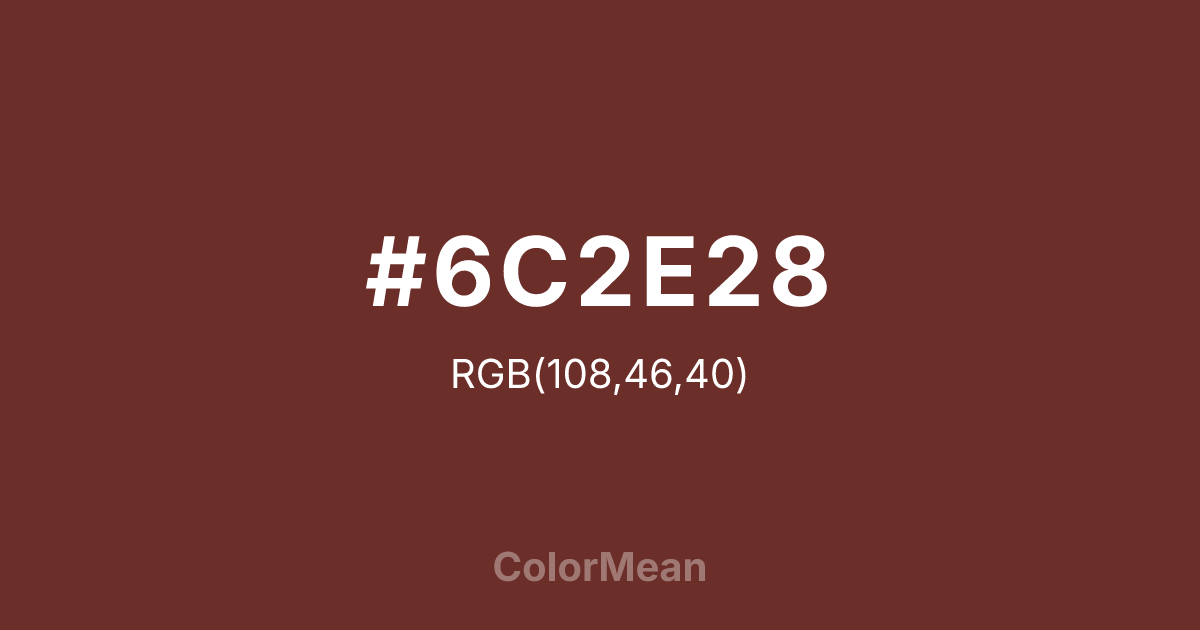 #6C2E28 RGB value is (108, 46, 40). The hex color red value is 108, green is 46, and blue is 40. Its HSL format shows a hue of 5°, saturation of 46 percent, and lightness of 29 percent. The CMYK process values are 0 percent, 57 percent, 63 percent, 58 percent.