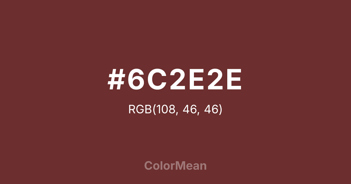 #6C2E2E RGB value is (108, 46, 46). The hex color red value is 108, green is 46, and blue is 46. Its HSL format shows a hue of 0°, saturation of 40 percent, and lightness of 30 percent. The CMYK process values are 0 percent, 57 percent, 57 percent, 58 percent.