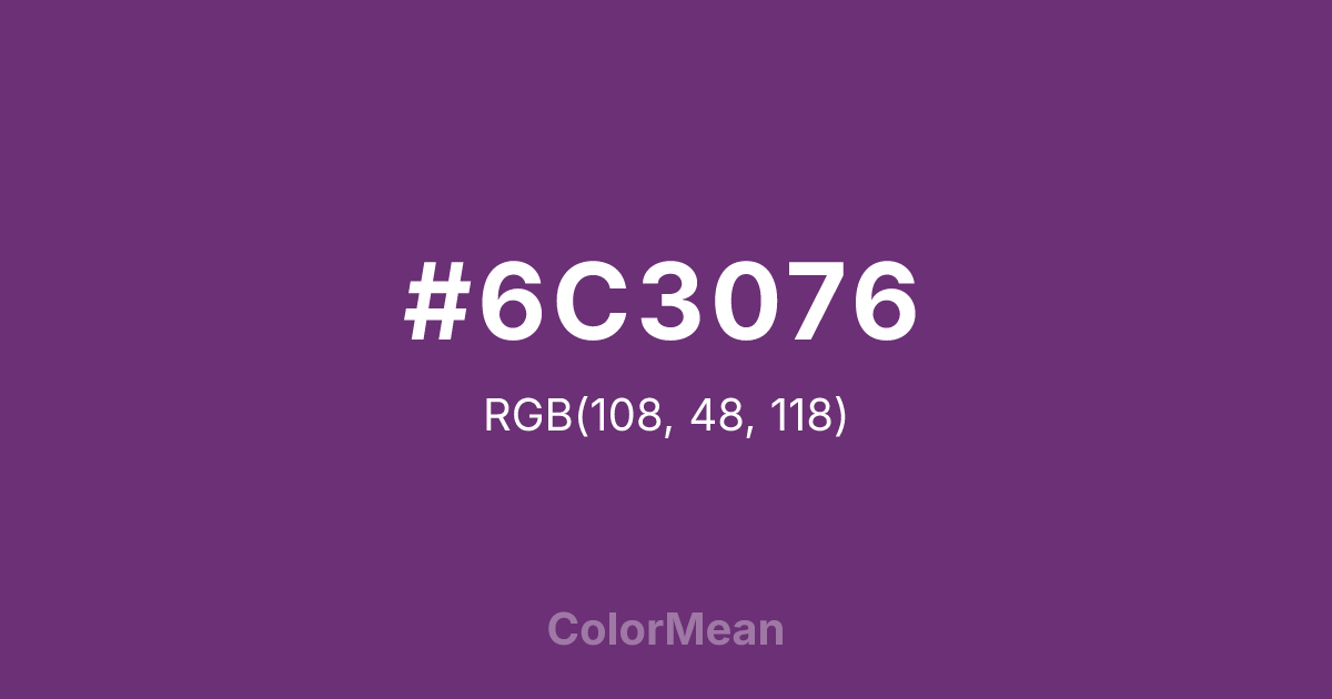 #6C3076 RGB value is (108, 48, 118). The hex color red value is 108, green is 48, and blue is 118. Its HSL format shows a hue of 291°, saturation of 42 percent, and lightness of 33 percent. The CMYK process values are 8 percent, 59 percent, 0 percent, 54 percent.
