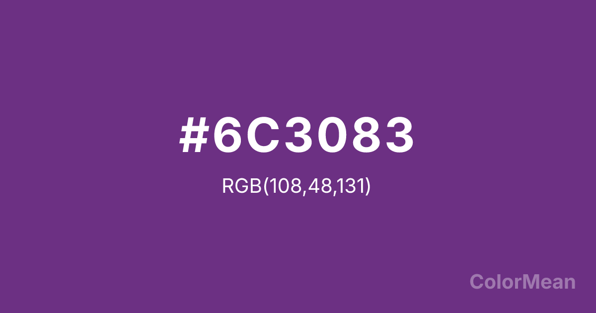 #6C3083 RGB value is (108, 48, 131). The hex color red value is 108, green is 48, and blue is 131. Its HSL format shows a hue of 283°, saturation of 46 percent, and lightness of 35 percent. The CMYK process values are 18 percent, 63 percent, 0 percent, 49 percent.