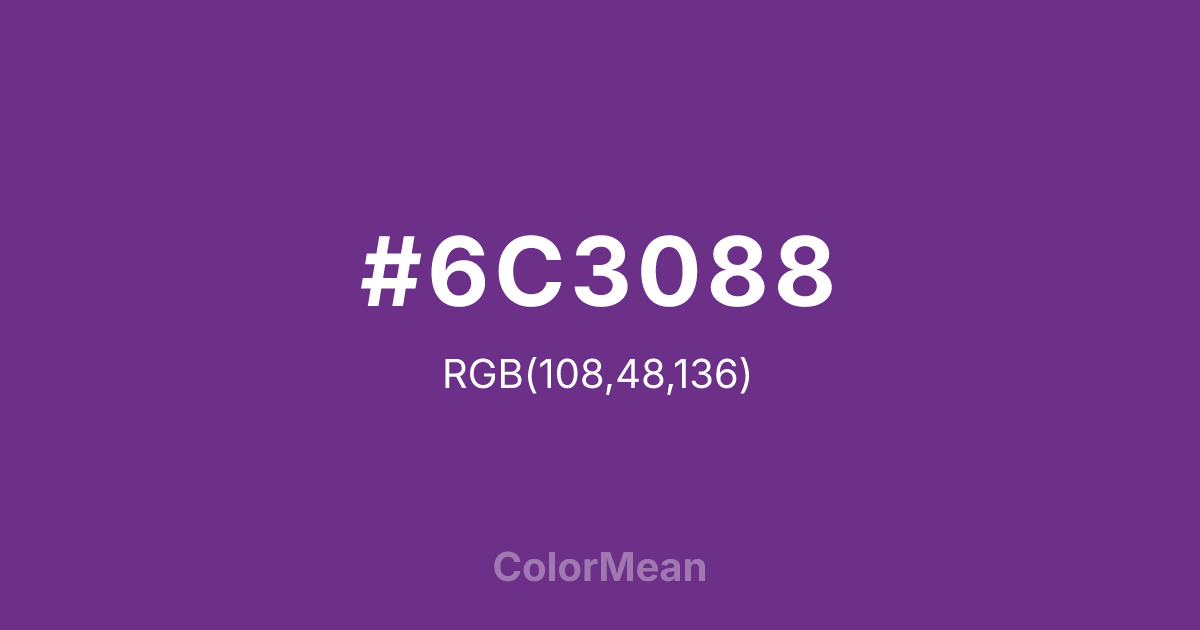 #6C3088 RGB value is (108, 48, 136). The hex color red value is 108, green is 48, and blue is 136. Its HSL format shows a hue of 281°, saturation of 48 percent, and lightness of 36 percent. The CMYK process values are 21 percent, 65 percent, 0 percent, 47 percent.