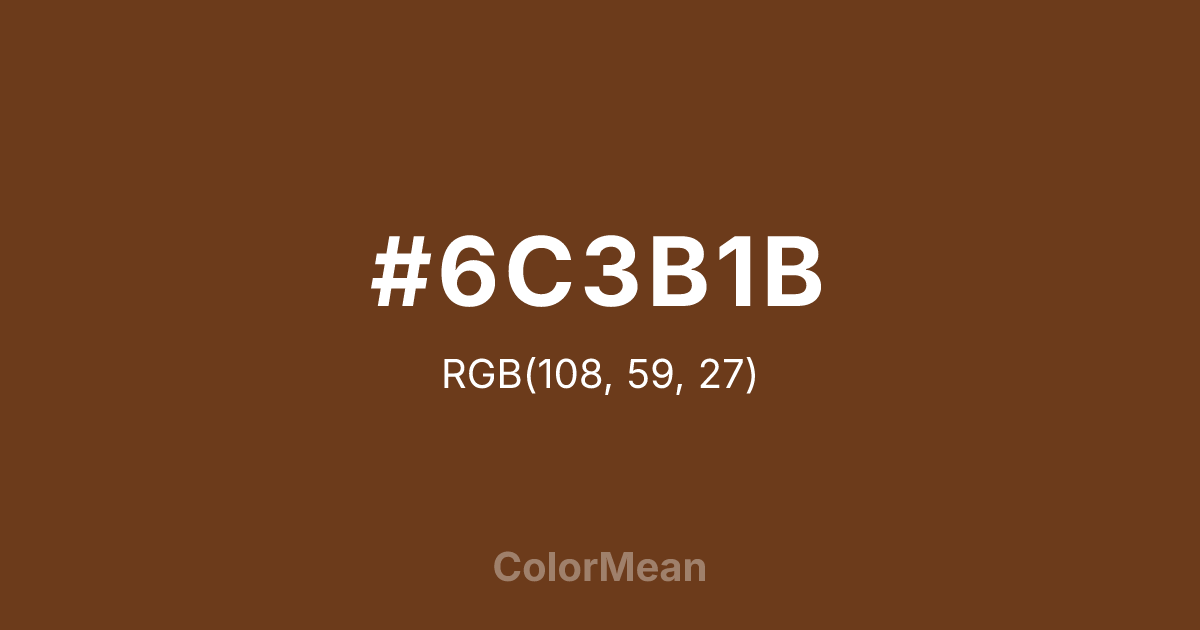 #6C3B1B RGB value is (108, 59, 27). The hex color red value is 108, green is 59, and blue is 27. Its HSL format shows a hue of 24°, saturation of 60 percent, and lightness of 26 percent. The CMYK process values are 0 percent, 45 percent, 75 percent, 58 percent.