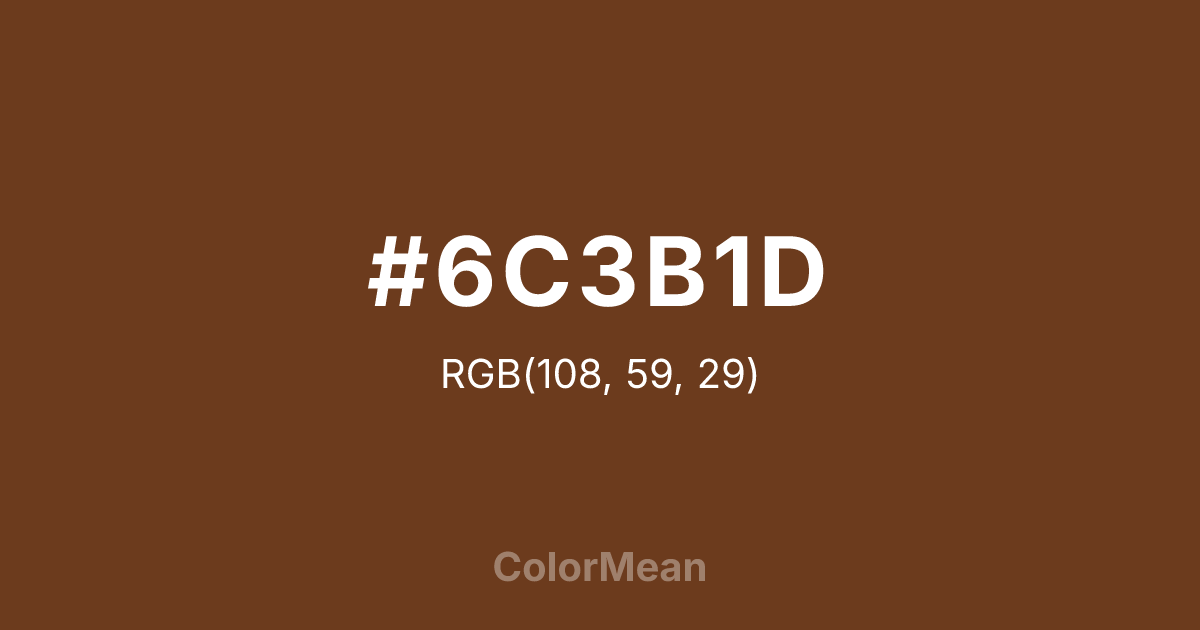 #6C3B1D RGB value is (108, 59, 29). The hex color red value is 108, green is 59, and blue is 29. Its HSL format shows a hue of 23°, saturation of 58 percent, and lightness of 27 percent. The CMYK process values are 0 percent, 45 percent, 73 percent, 58 percent.