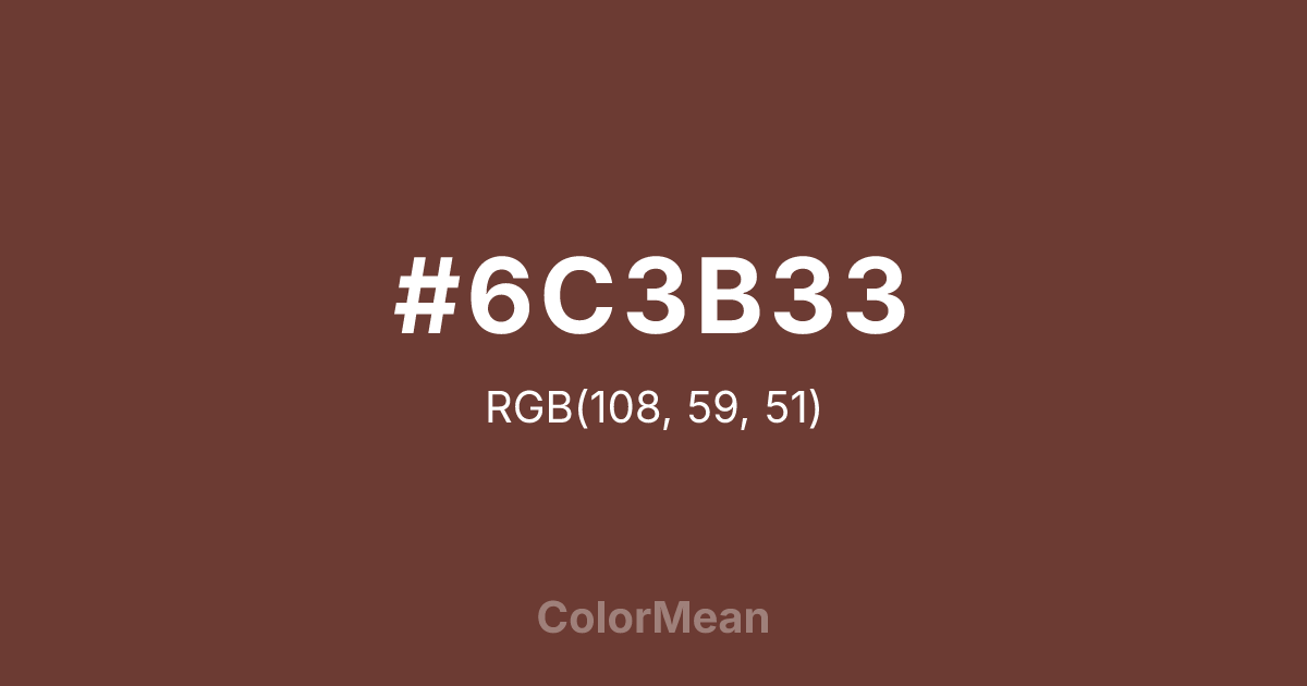 #6C3B33 RGB value is (108, 59, 51). The hex color red value is 108, green is 59, and blue is 51. Its HSL format shows a hue of 8°, saturation of 36 percent, and lightness of 31 percent. The CMYK process values are 0 percent, 45 percent, 53 percent, 58 percent.