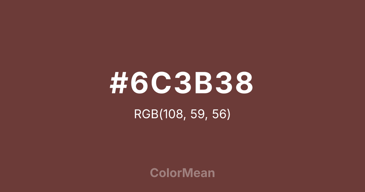 #6C3B38 RGB value is (108, 59, 56). The hex color red value is 108, green is 59, and blue is 56. Its HSL format shows a hue of 3°, saturation of 32 percent, and lightness of 32 percent. The CMYK process values are 0 percent, 45 percent, 48 percent, 58 percent.