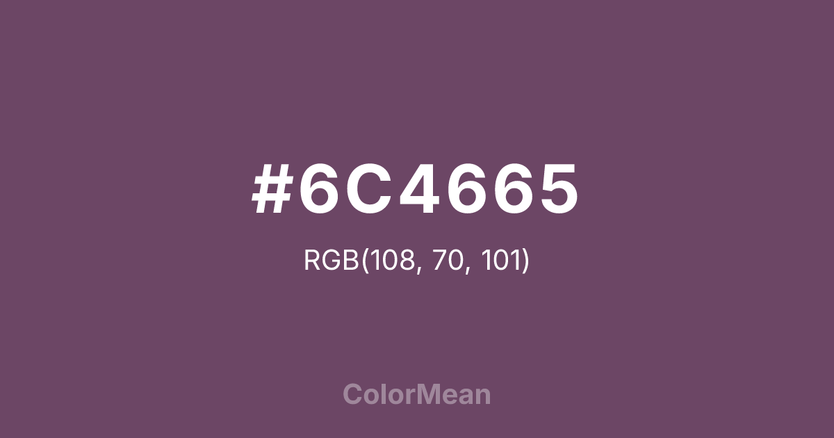 #6C4665 RGB value is (108, 70, 101). The hex color red value is 108, green is 70, and blue is 101. Its HSL format shows a hue of 311°, saturation of 21 percent, and lightness of 35 percent. The CMYK process values are 0 percent, 35 percent, 6 percent, 58 percent.