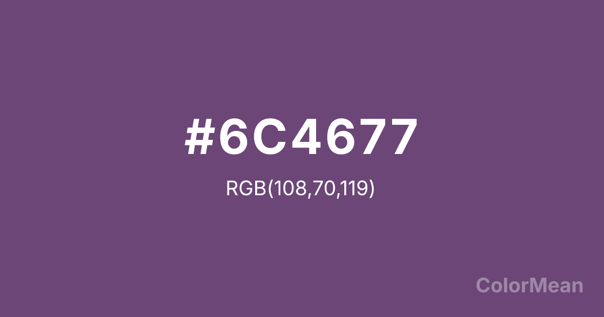 #6C4677 RGB value is (108, 70, 119). The hex color red value is 108, green is 70, and blue is 119. Its HSL format shows a hue of 287°, saturation of 26 percent, and lightness of 37 percent. The CMYK process values are 9 percent, 41 percent, 0 percent, 53 percent.