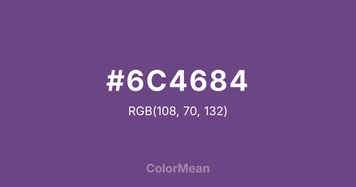#6C4684 RGB value is (108, 70, 132). The hex color red value is 108, green is 70, and blue is 132. Its HSL format shows a hue of 277°, saturation of 31 percent, and lightness of 40 percent. The CMYK process values are 18 percent, 47 percent, 0 percent, 48 percent.