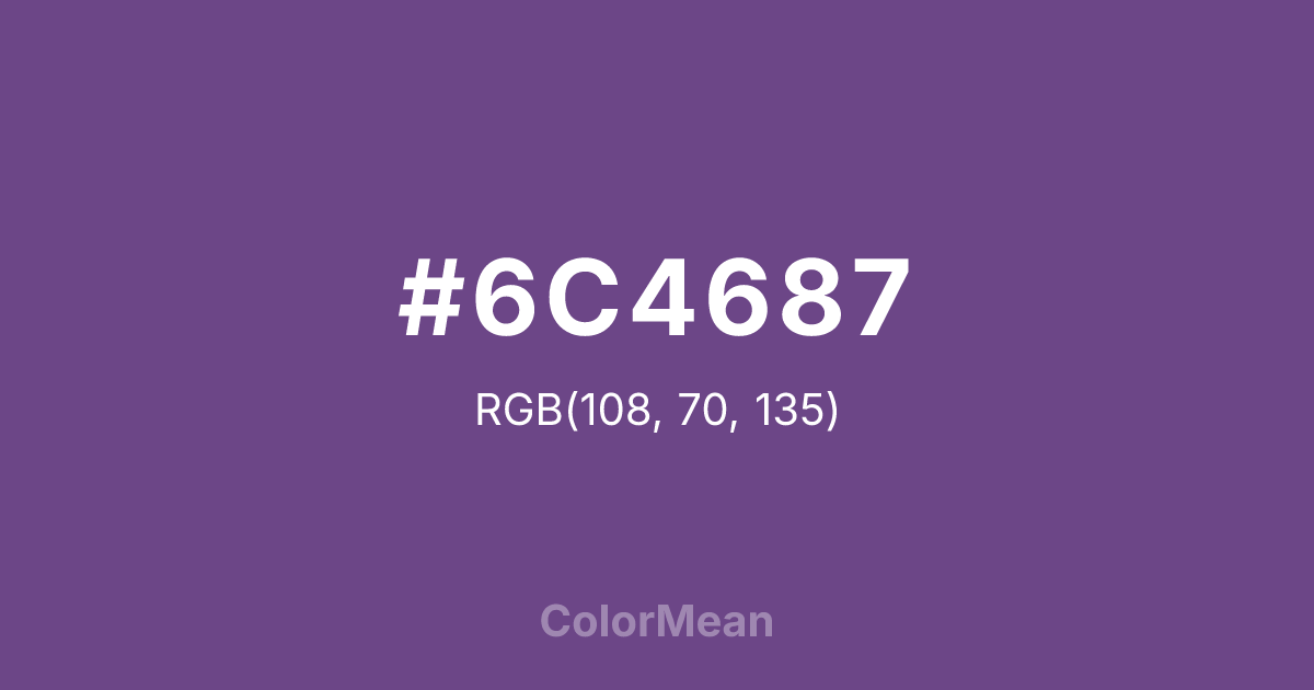 #6C4687 RGB value is (108, 70, 135). The hex color red value is 108, green is 70, and blue is 135. Its HSL format shows a hue of 275°, saturation of 32 percent, and lightness of 40 percent. The CMYK process values are 20 percent, 48 percent, 0 percent, 47 percent.