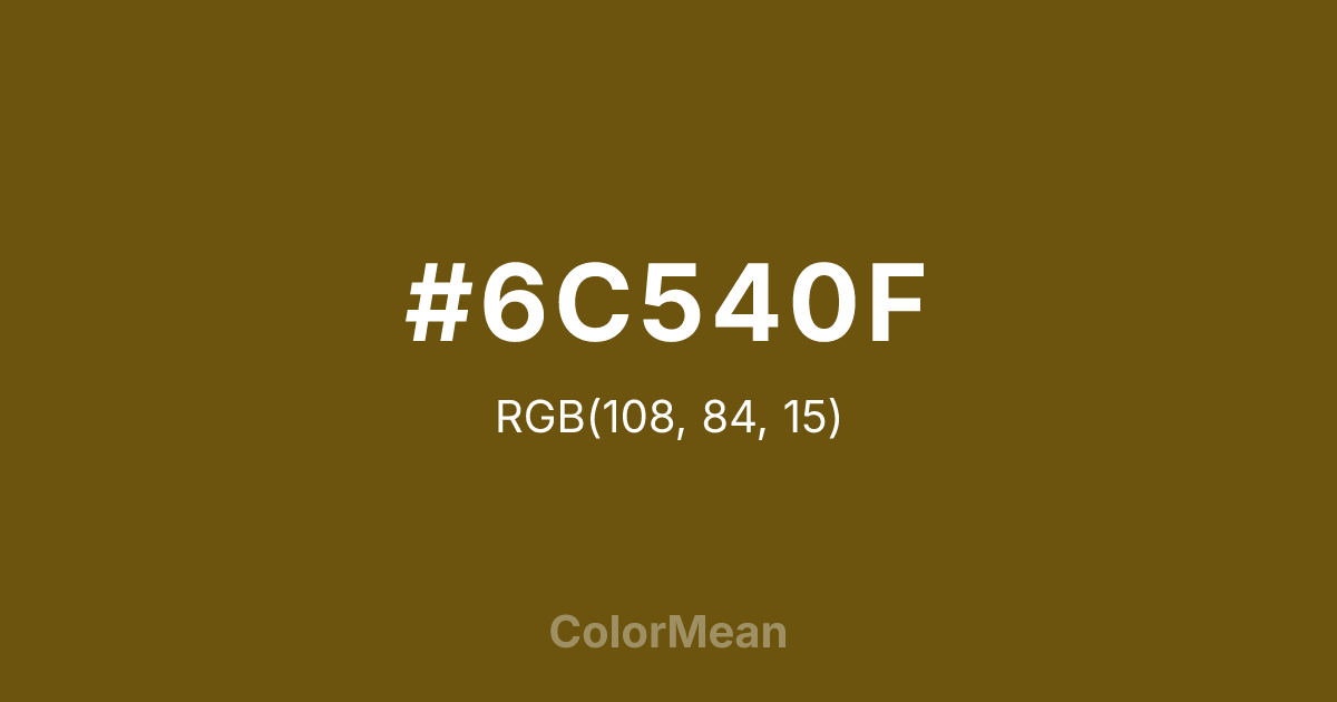 #6C540F RGB value is (108, 84, 15). The hex color red value is 108, green is 84, and blue is 15. Its HSL format shows a hue of 45°, saturation of 76 percent, and lightness of 24 percent. The CMYK process values are 0 percent, 22 percent, 86 percent, 58 percent.