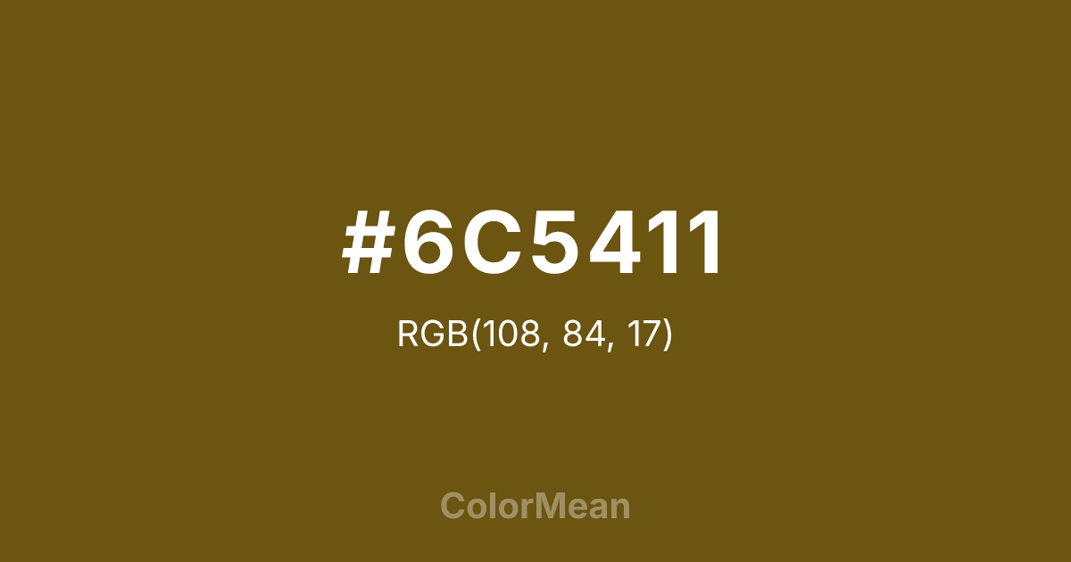 #6C5411 RGB value is (108, 84, 17). The hex color red value is 108, green is 84, and blue is 17. Its HSL format shows a hue of 44°, saturation of 73 percent, and lightness of 25 percent. The CMYK process values are 0 percent, 22 percent, 84 percent, 58 percent.