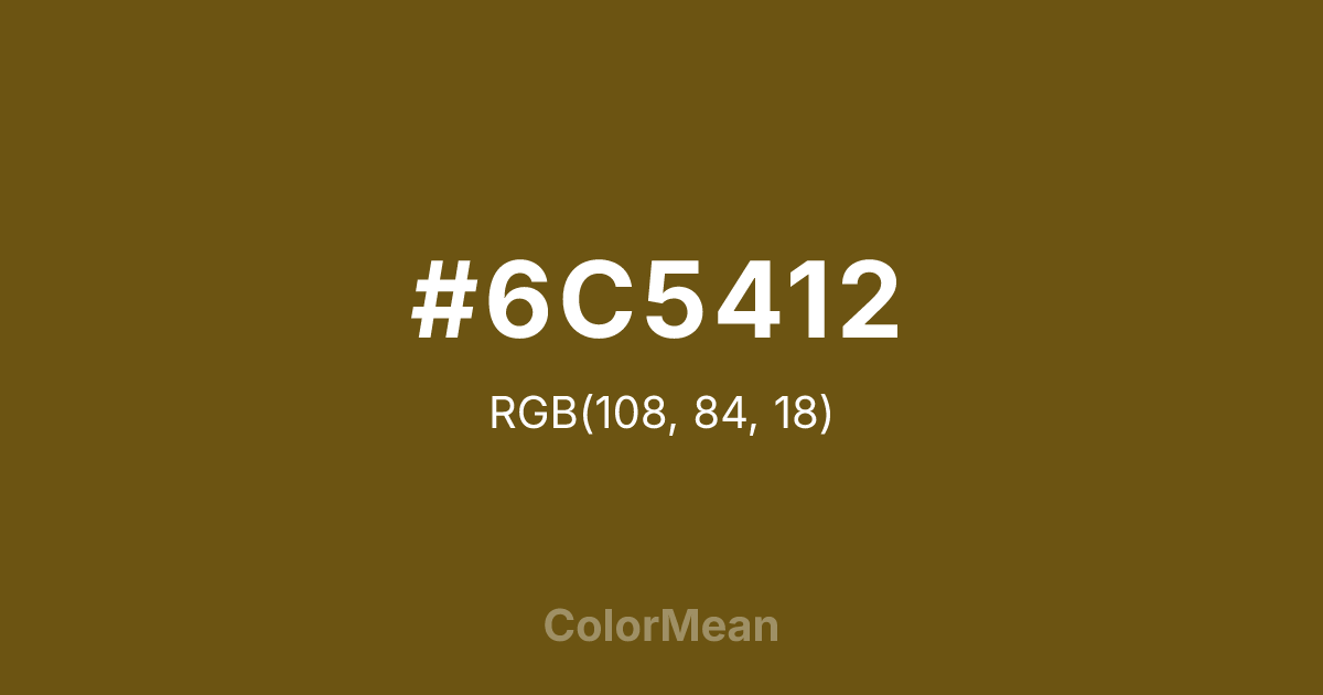 #6C5412 RGB value is (108, 84, 18). The hex color red value is 108, green is 84, and blue is 18. Its HSL format shows a hue of 44°, saturation of 71 percent, and lightness of 25 percent. The CMYK process values are 0 percent, 22 percent, 83 percent, 58 percent.