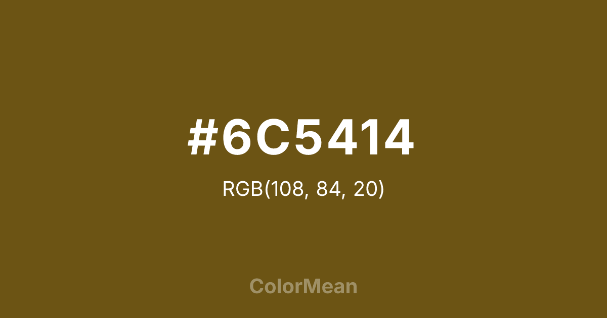 #6C5414 RGB value is (108, 84, 20). The hex color red value is 108, green is 84, and blue is 20. Its HSL format shows a hue of 44°, saturation of 69 percent, and lightness of 25 percent. The CMYK process values are 0 percent, 22 percent, 81 percent, 58 percent.