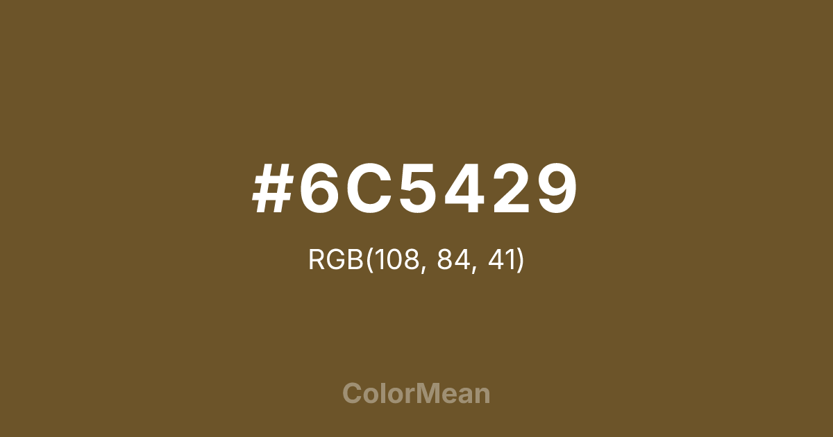 #6C5429 RGB value is (108, 84, 41). The hex color red value is 108, green is 84, and blue is 41. Its HSL format shows a hue of 39°, saturation of 45 percent, and lightness of 29 percent. The CMYK process values are 0 percent, 22 percent, 62 percent, 58 percent.