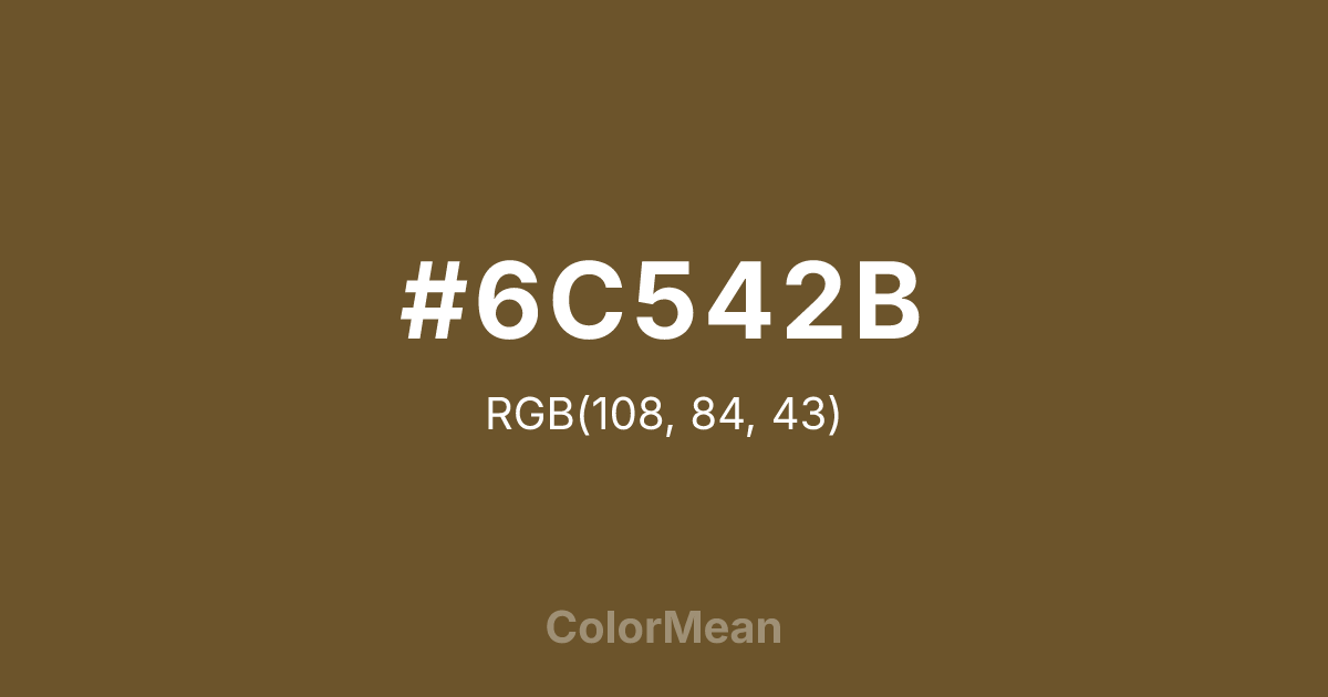 #6C542B RGB value is (108, 84, 43). The hex color red value is 108, green is 84, and blue is 43. Its HSL format shows a hue of 38°, saturation of 43 percent, and lightness of 30 percent. The CMYK process values are 0 percent, 22 percent, 60 percent, 58 percent.