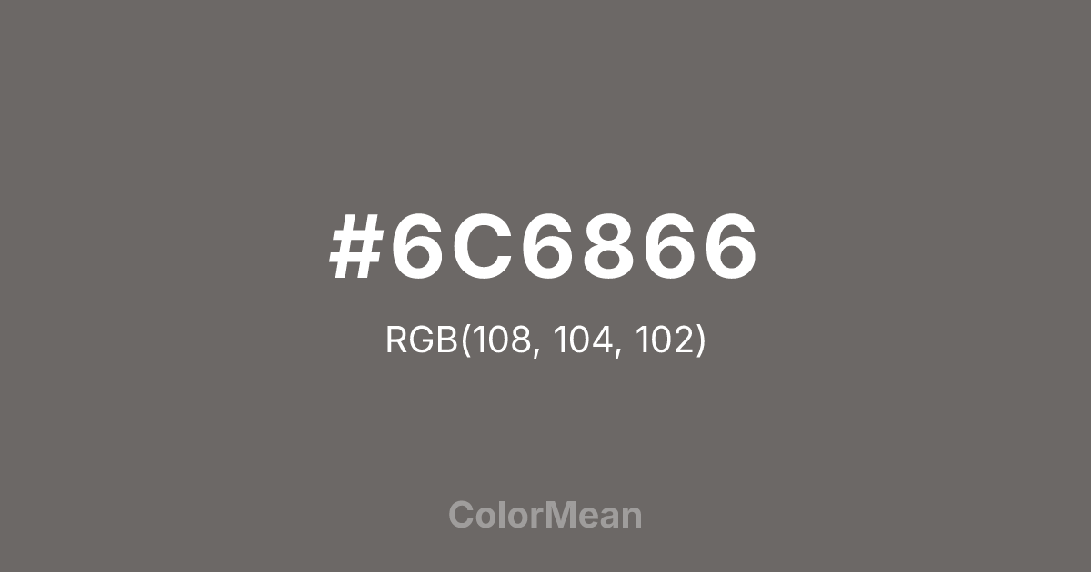 #6C6866 RGB value is (108, 104, 102). The hex color red value is 108, green is 104, and blue is 102. Its HSL format shows a hue of 20°, saturation of 3 percent, and lightness of 41 percent. The CMYK process values are 0 percent, 4 percent, 6 percent, 58 percent.