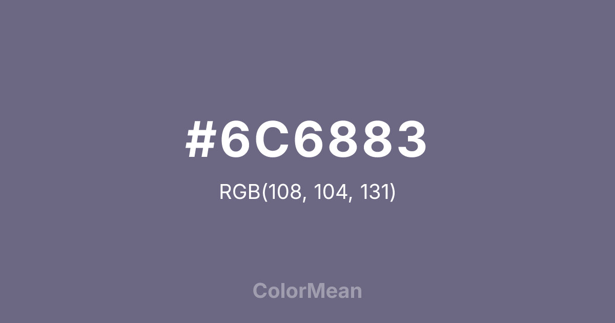 #6C6883 RGB value is (108, 104, 131). The hex color red value is 108, green is 104, and blue is 131. Its HSL format shows a hue of 249°, saturation of 11 percent, and lightness of 46 percent. The CMYK process values are 18 percent, 21 percent, 0 percent, 49 percent.