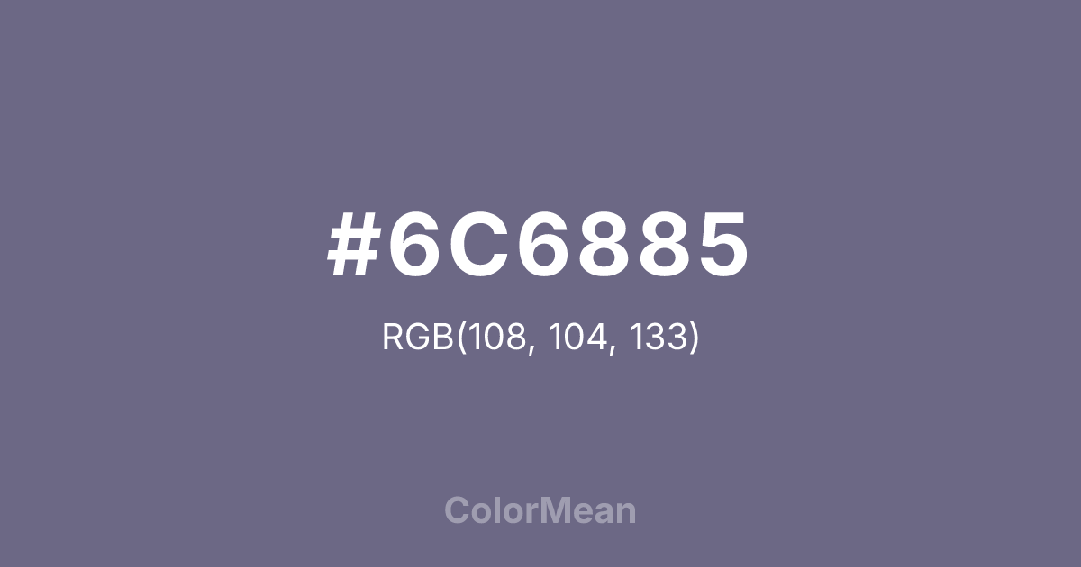 #6C6885 RGB value is (108, 104, 133). The hex color red value is 108, green is 104, and blue is 133. Its HSL format shows a hue of 248°, saturation of 12 percent, and lightness of 46 percent. The CMYK process values are 19 percent, 22 percent, 0 percent, 48 percent.