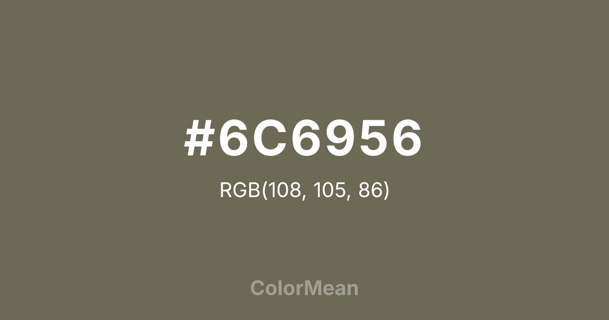 #6C6956 RGB value is (108, 105, 86). The hex color red value is 108, green is 105, and blue is 86. Its HSL format shows a hue of 52°, saturation of 11 percent, and lightness of 38 percent. The CMYK process values are 0 percent, 3 percent, 20 percent, 58 percent.