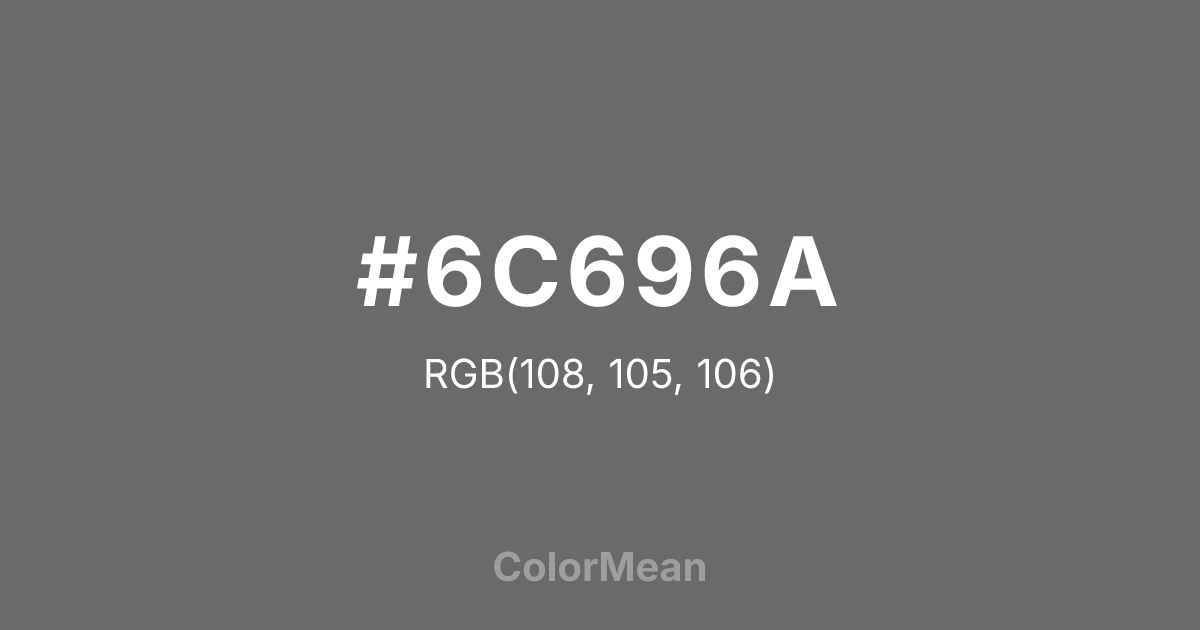 #6C696A RGB value is (108, 105, 106). The hex color red value is 108, green is 105, and blue is 106. Its HSL format shows a hue of 340°, saturation of 1 percent, and lightness of 42 percent. The CMYK process values are 0 percent, 3 percent, 2 percent, 58 percent.