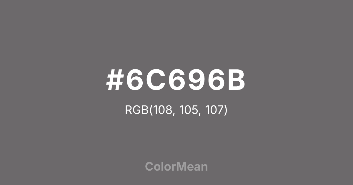 #6C696B RGB value is (108, 105, 107). The hex color red value is 108, green is 105, and blue is 107. Its HSL format shows a hue of 320°, saturation of 1 percent, and lightness of 42 percent. The CMYK process values are 0 percent, 3 percent, 1 percent, 58 percent.