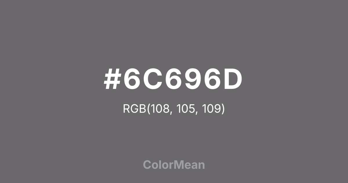 #6C696D RGB value is (108, 105, 109). The hex color red value is 108, green is 105, and blue is 109. Its HSL format shows a hue of 285°, saturation of 2 percent, and lightness of 42 percent. The CMYK process values are 1 percent, 4 percent, 0 percent, 57 percent.