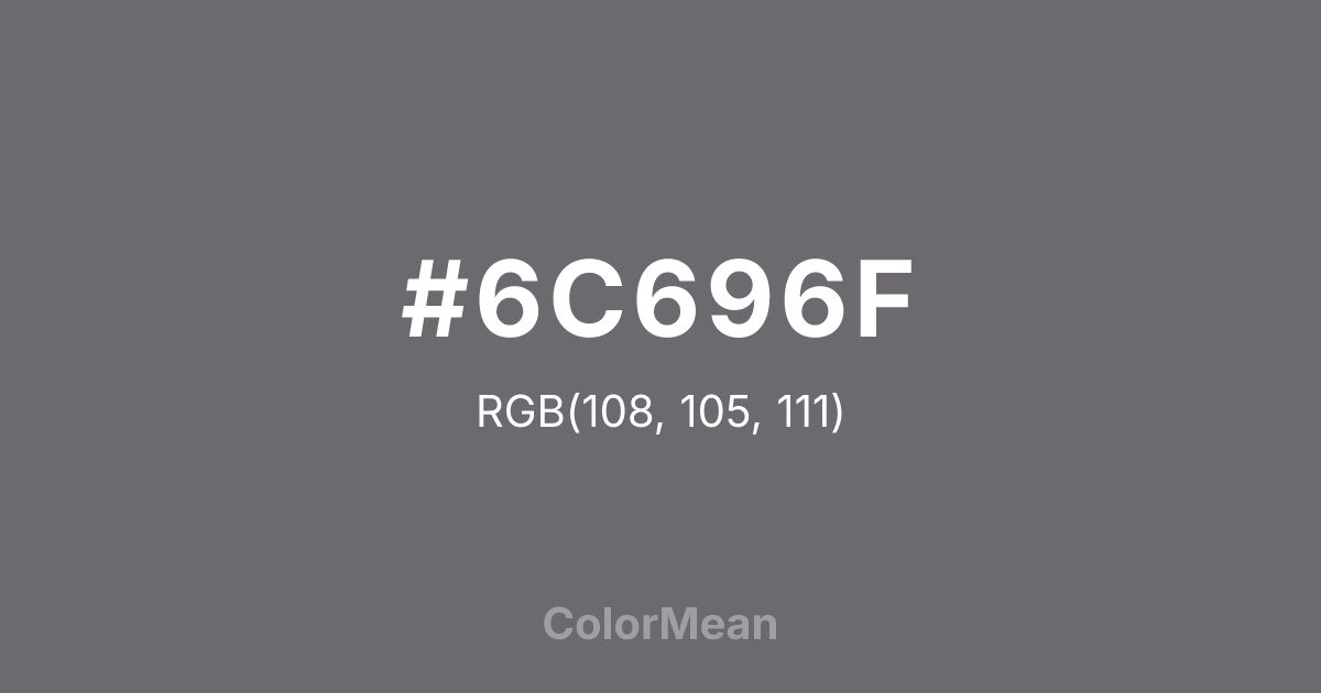 #6C696F RGB value is (108, 105, 111). The hex color red value is 108, green is 105, and blue is 111. Its HSL format shows a hue of 270°, saturation of 3 percent, and lightness of 42 percent. The CMYK process values are 3 percent, 5 percent, 0 percent, 56 percent.