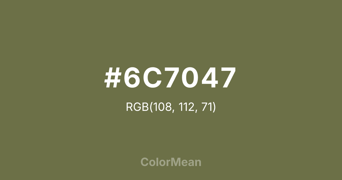 #6C7047 RGB value is (108, 112, 71). The hex color red value is 108, green is 112, and blue is 71. Its HSL format shows a hue of 66°, saturation of 22 percent, and lightness of 36 percent. The CMYK process values are 4 percent, 0 percent, 37 percent, 56 percent.