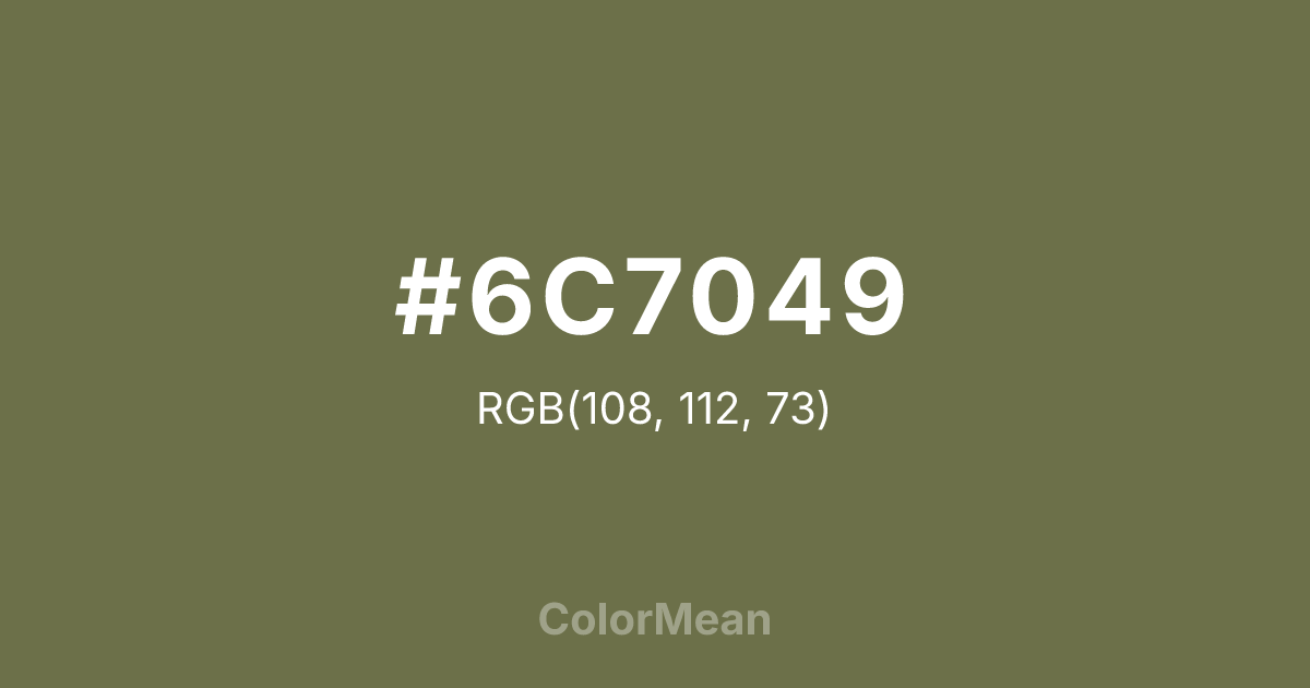 #6C7049 RGB value is (108, 112, 73). The hex color red value is 108, green is 112, and blue is 73. Its HSL format shows a hue of 66°, saturation of 21 percent, and lightness of 36 percent. The CMYK process values are 4 percent, 0 percent, 35 percent, 56 percent.