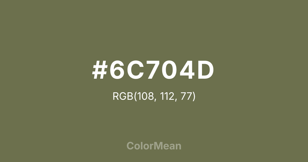 #6C704D RGB value is (108, 112, 77). The hex color red value is 108, green is 112, and blue is 77. Its HSL format shows a hue of 67°, saturation of 19 percent, and lightness of 37 percent. The CMYK process values are 4 percent, 0 percent, 31 percent, 56 percent.