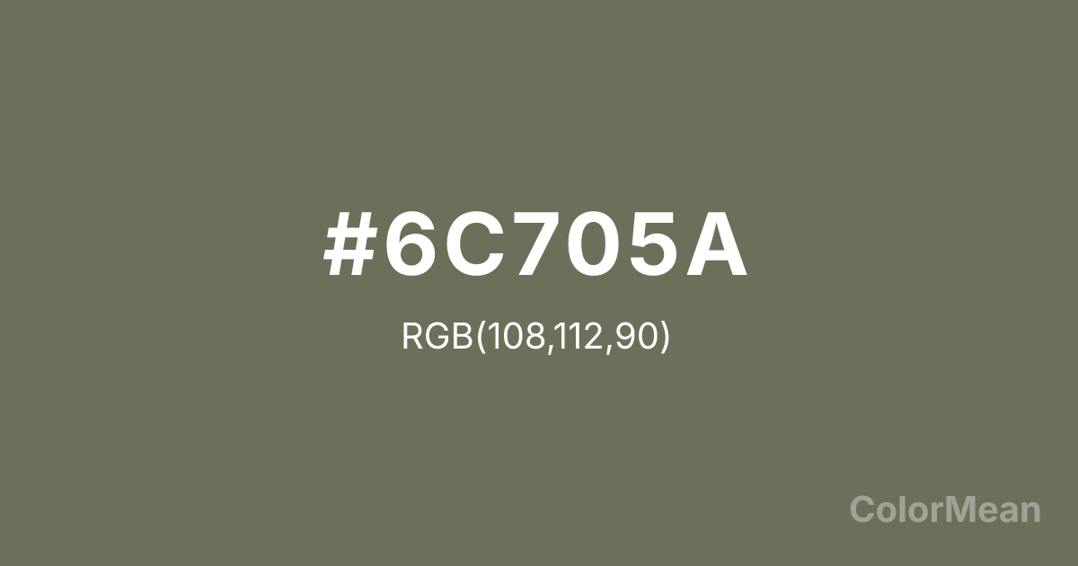 #6C705A RGB value is (108, 112, 90). The hex color red value is 108, green is 112, and blue is 90. Its HSL format shows a hue of 71°, saturation of 11 percent, and lightness of 40 percent. The CMYK process values are 4 percent, 0 percent, 20 percent, 56 percent.