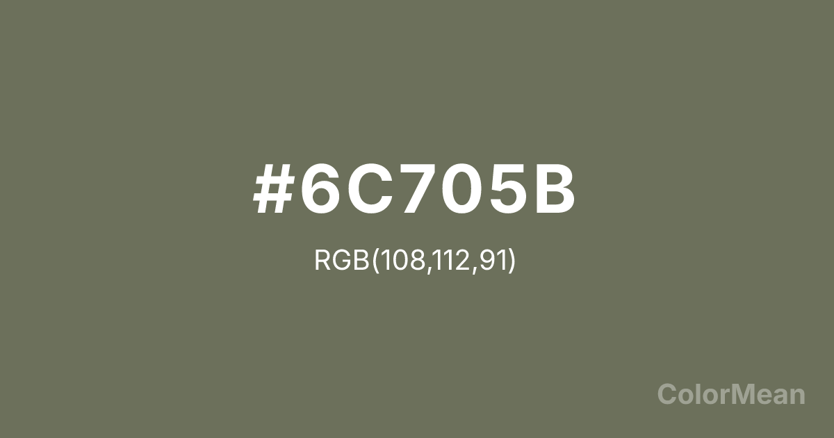 #6C705B RGB value is (108, 112, 91). The hex color red value is 108, green is 112, and blue is 91. Its HSL format shows a hue of 71°, saturation of 10 percent, and lightness of 40 percent. The CMYK process values are 4 percent, 0 percent, 19 percent, 56 percent.