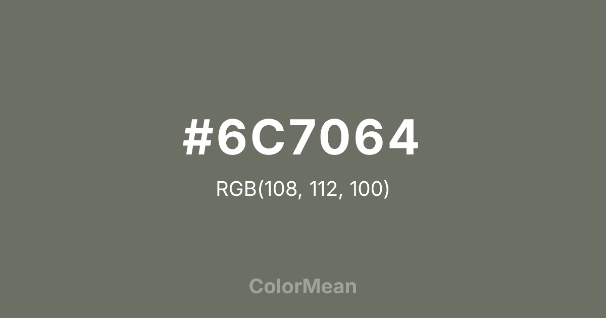 #6C7064 RGB value is (108, 112, 100). The hex color red value is 108, green is 112, and blue is 100. Its HSL format shows a hue of 80°, saturation of 6 percent, and lightness of 42 percent. The CMYK process values are 4 percent, 0 percent, 11 percent, 56 percent.