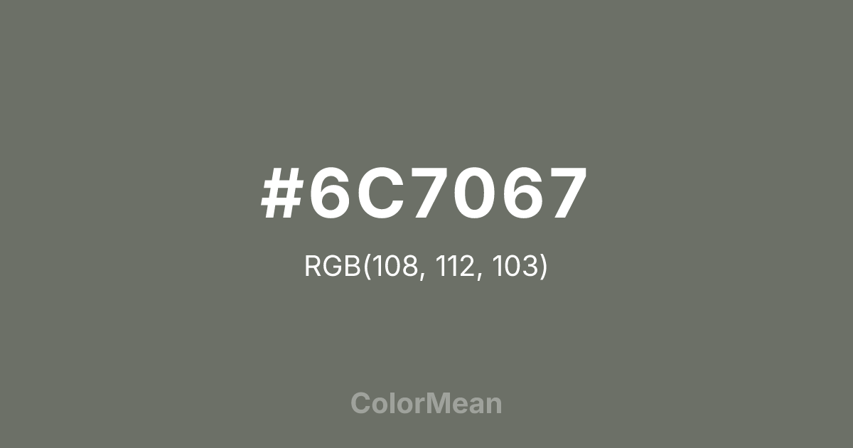 #6C7067 RGB value is (108, 112, 103). The hex color red value is 108, green is 112, and blue is 103. Its HSL format shows a hue of 87°, saturation of 4 percent, and lightness of 42 percent. The CMYK process values are 4 percent, 0 percent, 8 percent, 56 percent.