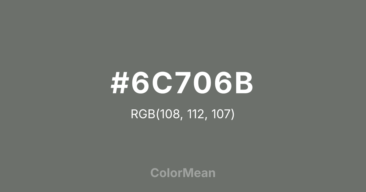 #6C706B RGB value is (108, 112, 107). The hex color red value is 108, green is 112, and blue is 107. Its HSL format shows a hue of 108°, saturation of 2 percent, and lightness of 43 percent. The CMYK process values are 4 percent, 0 percent, 4 percent, 56 percent.