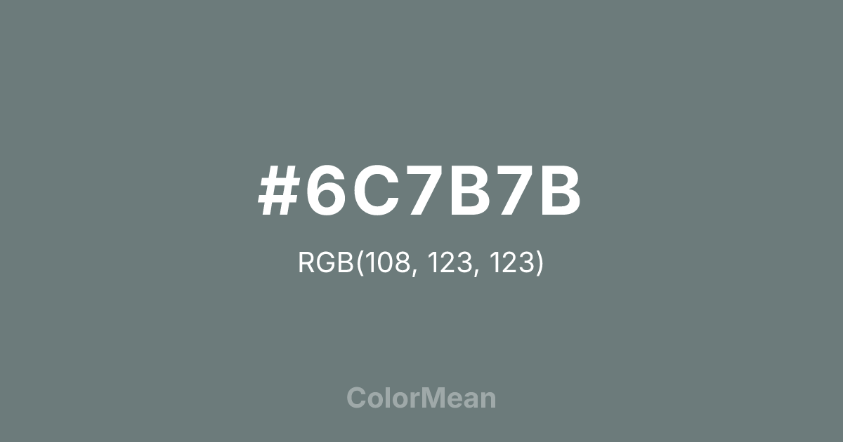 #6C7B7B RGB value is (108, 123, 123). The hex color red value is 108, green is 123, and blue is 123. Its HSL format shows a hue of 180°, saturation of 6 percent, and lightness of 45 percent. The CMYK process values are 12 percent, 0 percent, 0 percent, 52 percent.