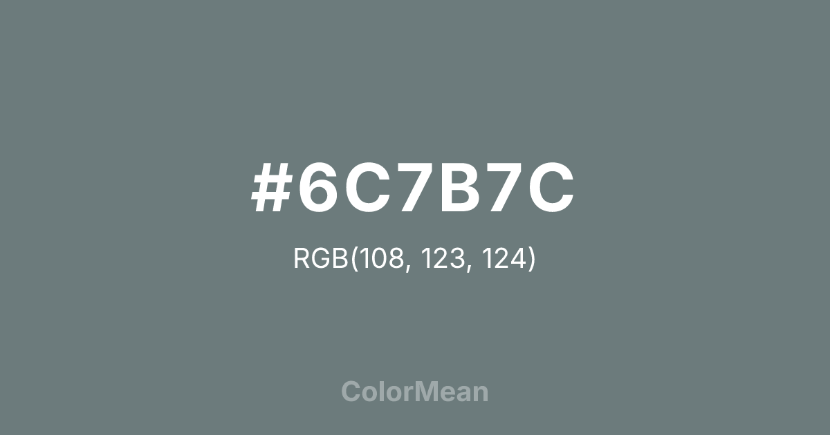 #6C7B7C RGB value is (108, 123, 124). The hex color red value is 108, green is 123, and blue is 124. Its HSL format shows a hue of 184°, saturation of 7 percent, and lightness of 45 percent. The CMYK process values are 13 percent, 1 percent, 0 percent, 51 percent.
