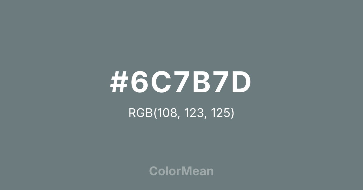 #6C7B7D RGB value is (108, 123, 125). The hex color red value is 108, green is 123, and blue is 125. Its HSL format shows a hue of 187°, saturation of 7 percent, and lightness of 46 percent. The CMYK process values are 14 percent, 2 percent, 0 percent, 51 percent.
