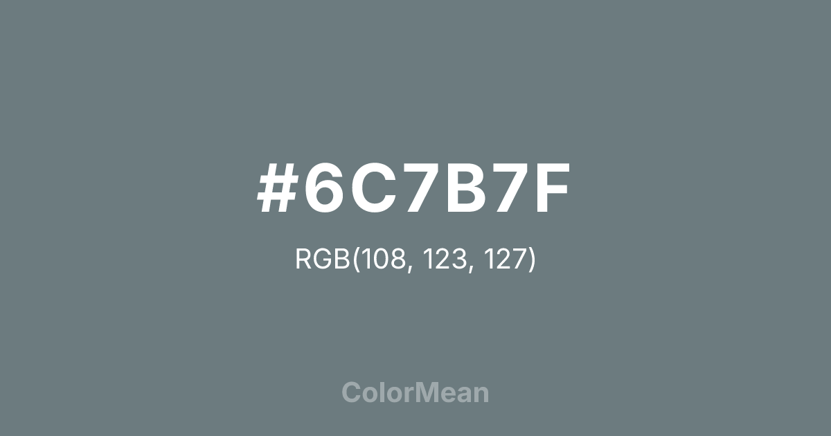 #6C7B7F RGB value is (108, 123, 127). The hex color red value is 108, green is 123, and blue is 127. Its HSL format shows a hue of 193°, saturation of 8 percent, and lightness of 46 percent. The CMYK process values are 15 percent, 3 percent, 0 percent, 50 percent.