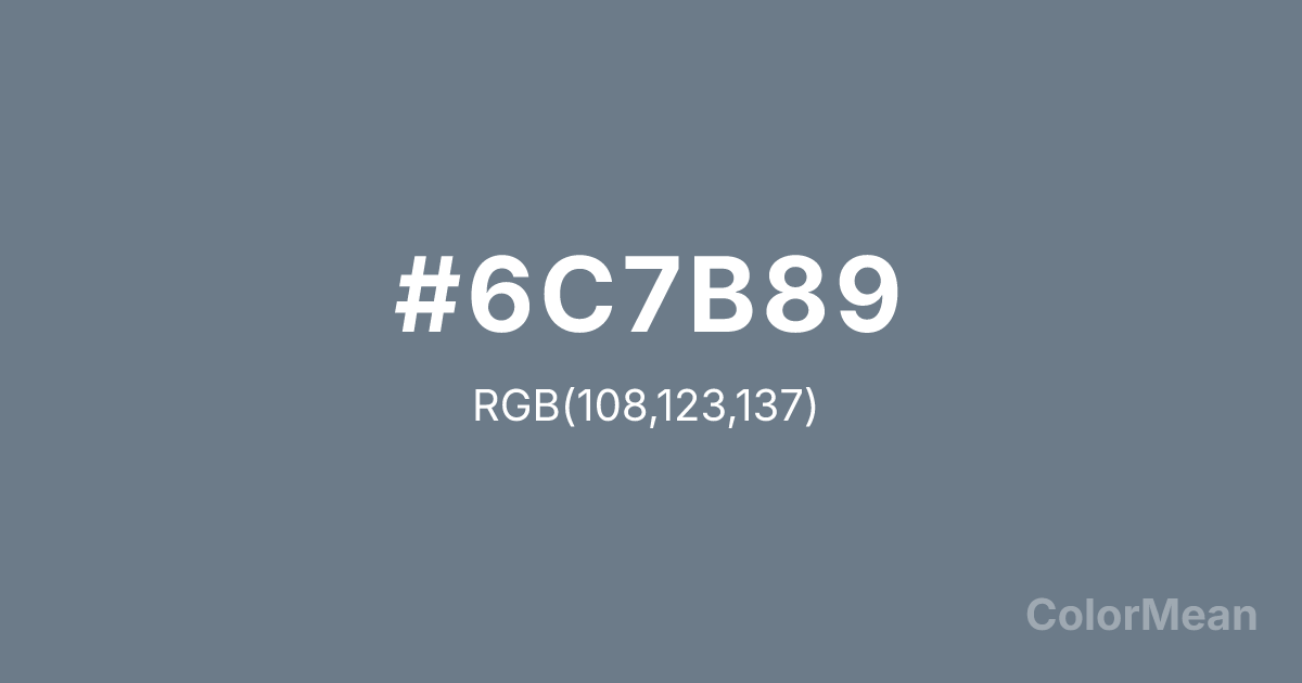 #6C7B89 RGB value is (108, 123, 137). The hex color red value is 108, green is 123, and blue is 137. Its HSL format shows a hue of 209°, saturation of 12 percent, and lightness of 48 percent. The CMYK process values are 21 percent, 10 percent, 0 percent, 46 percent.