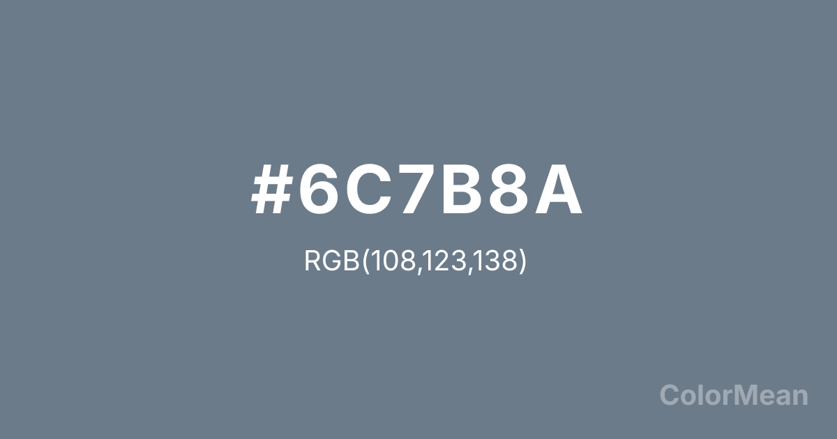 #6C7B8A RGB value is (108, 123, 138). The hex color red value is 108, green is 123, and blue is 138. Its HSL format shows a hue of 210°, saturation of 12 percent, and lightness of 48 percent. The CMYK process values are 22 percent, 11 percent, 0 percent, 46 percent.