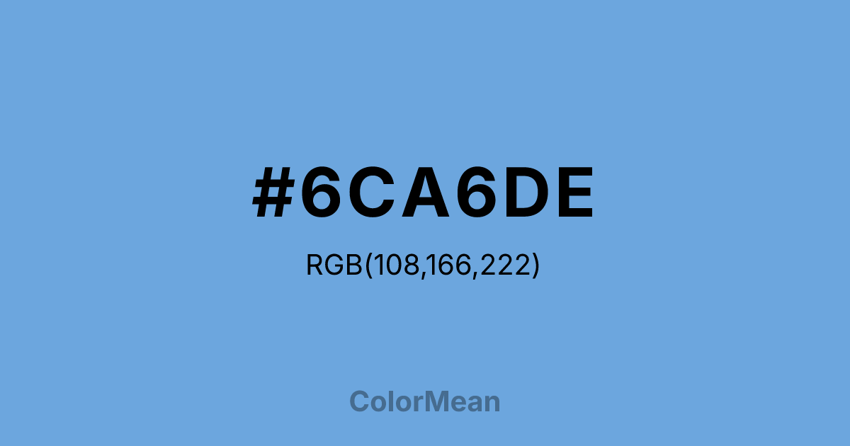 #6CA6DE RGB value is (108, 166, 222). The hex color red value is 108, green is 166, and blue is 222. Its HSL format shows a hue of 209°, saturation of 63 percent, and lightness of 65 percent. The CMYK process values are 51 percent, 25 percent, 0 percent, 13 percent.