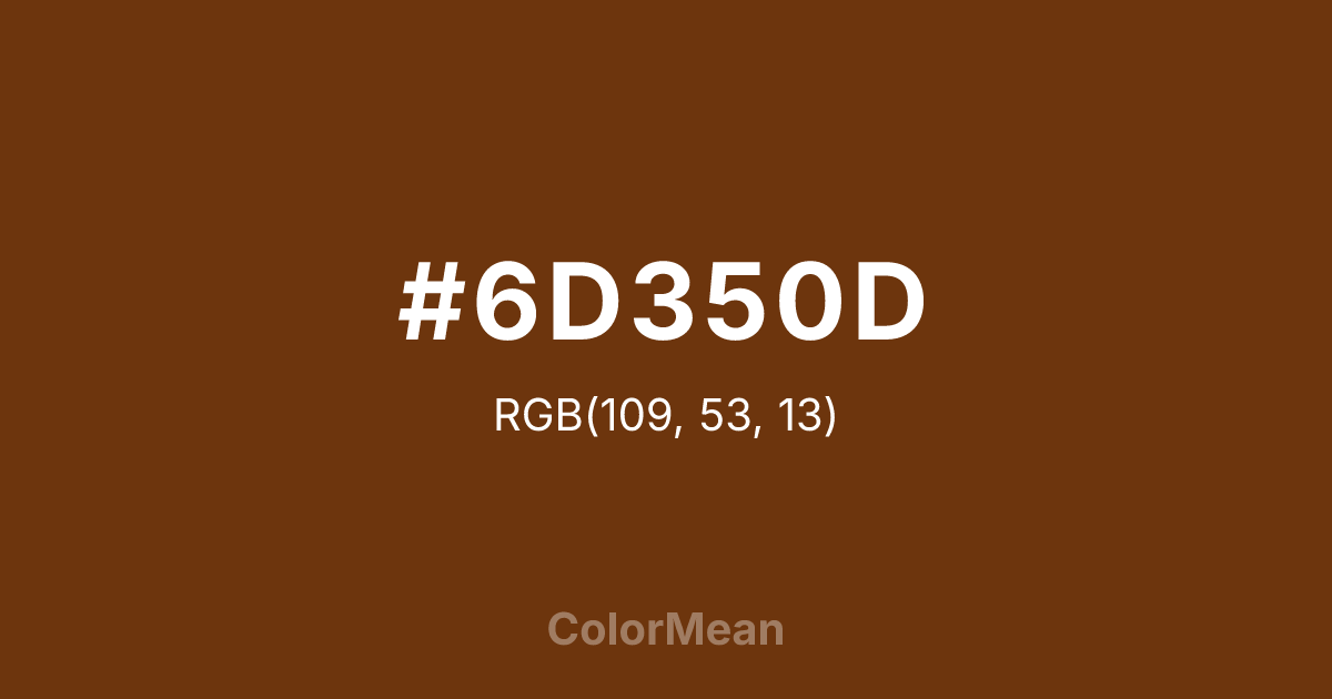 #6D350D RGB value is (109, 53, 13). The hex color red value is 109, green is 53, and blue is 13. Its HSL format shows a hue of 25°, saturation of 79 percent, and lightness of 24 percent. The CMYK process values are 0 percent, 51 percent, 88 percent, 57 percent.
