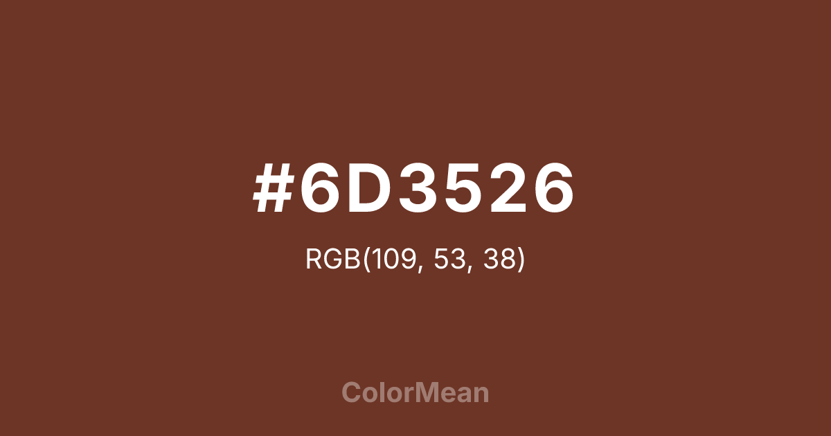 #6D3526 RGB value is (109, 53, 38). The hex color red value is 109, green is 53, and blue is 38. Its HSL format shows a hue of 13°, saturation of 48 percent, and lightness of 29 percent. The CMYK process values are 0 percent, 51 percent, 65 percent, 57 percent.