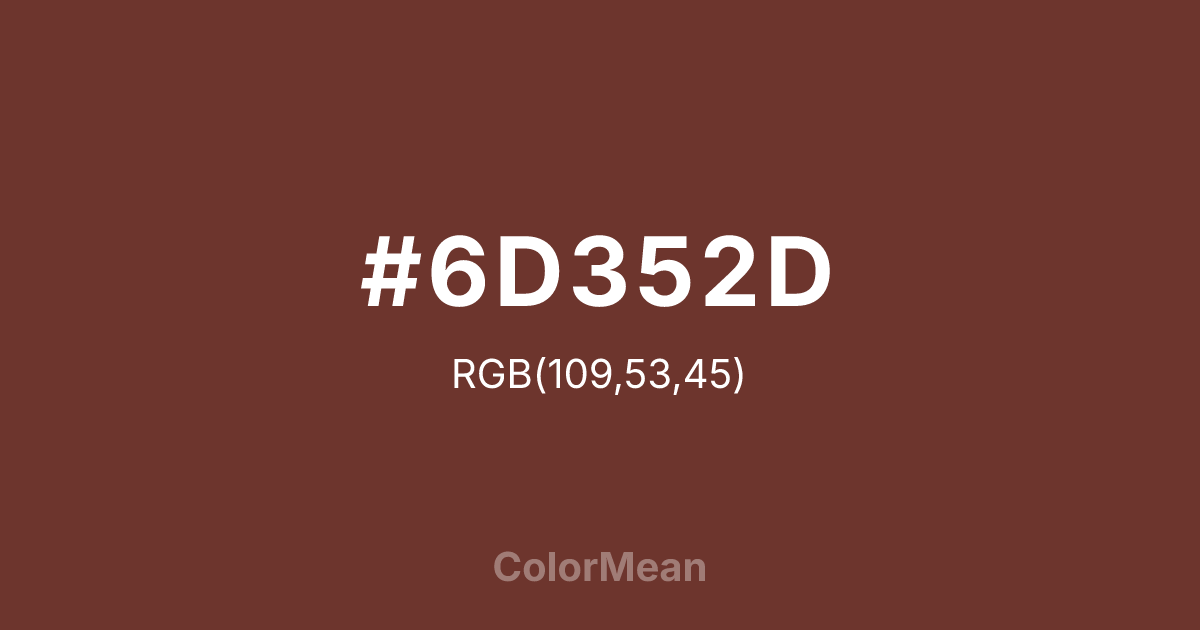 #6D352D RGB value is (109, 53, 45). The hex color red value is 109, green is 53, and blue is 45. Its HSL format shows a hue of 8°, saturation of 42 percent, and lightness of 30 percent. The CMYK process values are 0 percent, 51 percent, 59 percent, 57 percent.