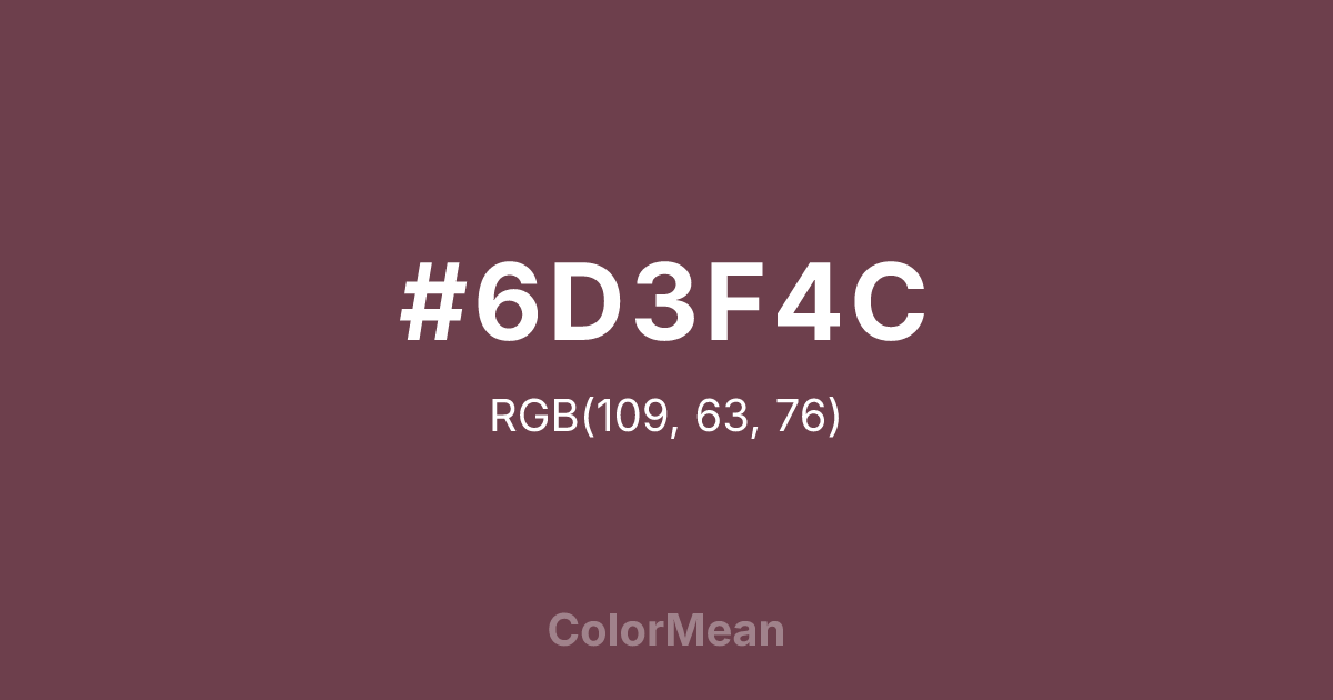 #6D3F4C RGB value is (109, 63, 76). The hex color red value is 109, green is 63, and blue is 76. Its HSL format shows a hue of 343°, saturation of 27 percent, and lightness of 34 percent. The CMYK process values are 0 percent, 42 percent, 30 percent, 57 percent.