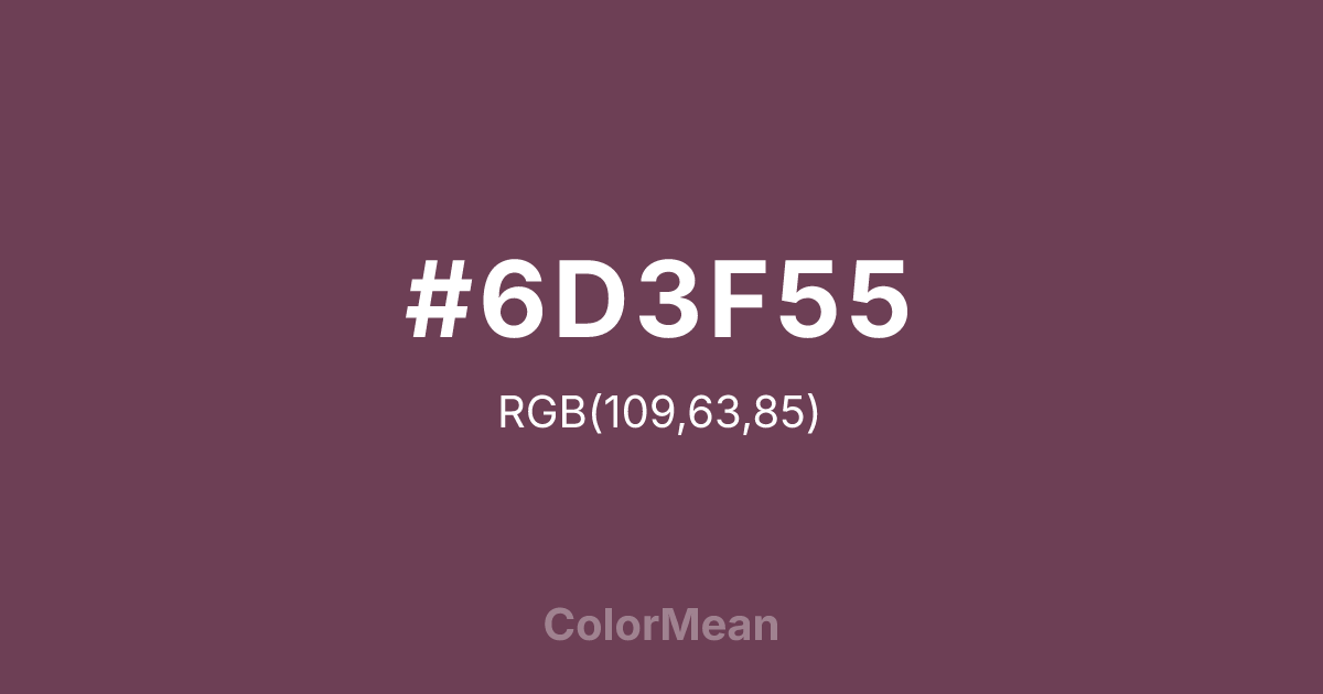 #6D3F55 RGB value is (109, 63, 85). The hex color red value is 109, green is 63, and blue is 85. Its HSL format shows a hue of 331°, saturation of 27 percent, and lightness of 34 percent. The CMYK process values are 0 percent, 42 percent, 22 percent, 57 percent.