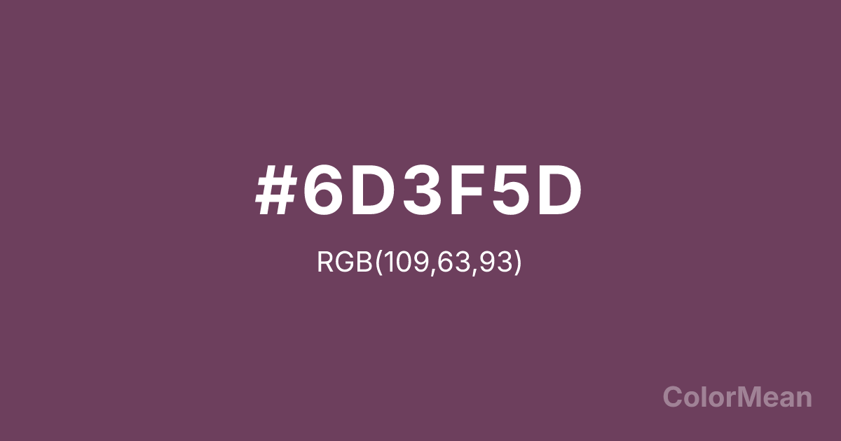 #6D3F5D RGB value is (109, 63, 93). The hex color red value is 109, green is 63, and blue is 93. Its HSL format shows a hue of 321°, saturation of 27 percent, and lightness of 34 percent. The CMYK process values are 0 percent, 42 percent, 15 percent, 57 percent.