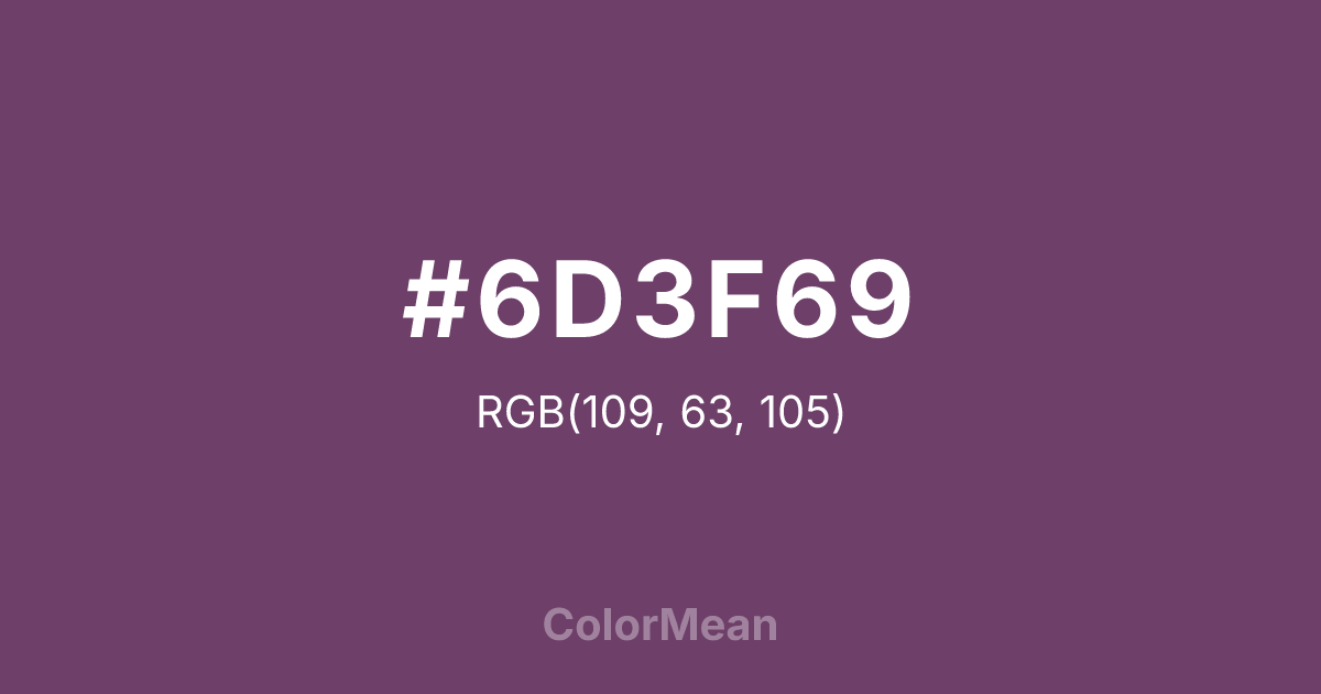 #6D3F69 RGB value is (109, 63, 105). The hex color red value is 109, green is 63, and blue is 105. Its HSL format shows a hue of 305°, saturation of 27 percent, and lightness of 34 percent. The CMYK process values are 0 percent, 42 percent, 4 percent, 57 percent.